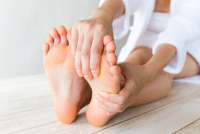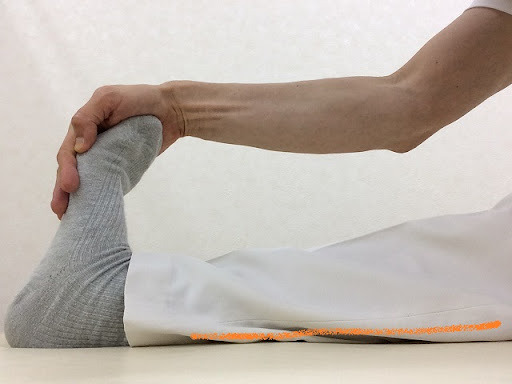종아리에 쥐가 났다면 발끝을 몸 쪽으로 당겨 종아리 근육을 스트레칭한다. - 손으로 근육을 마사지한다